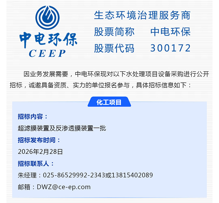 中電環(huán)保股份有限公司是南京市首家環(huán)保上市公司(股票簡(jiǎn)稱:中電環(huán)保,股票代碼:300172),南京環(huán)保產(chǎn)業(yè)協(xié)會(huì)會(huì)長(zhǎng)單位,國(guó)家級(jí)聯(lián)盟理事長(zhǎng)單位,是生態(tài)環(huán)境治理服務(wù)商,主營(yíng)(3+1):水務(wù)、固危廢、煙氣治理及產(chǎn)業(yè)創(chuàng)新平臺(tái),包括:工業(yè)水處理、污水處理及水環(huán)境綜合治理;固危廢土壤、污泥餐廚垃圾處理;煙氣及VOCS治理;智慧環(huán)保;高端裝備等。